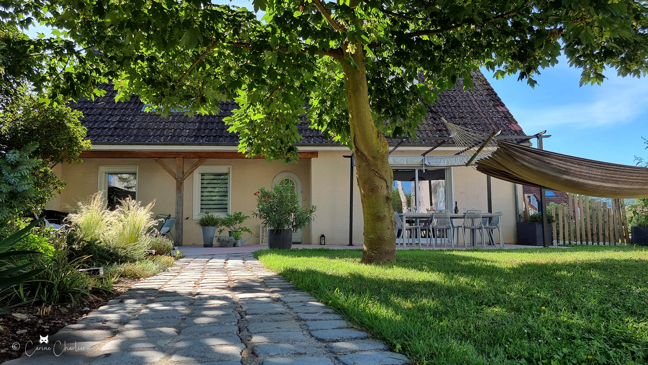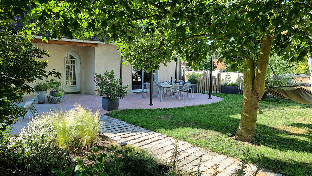 Vous pourrez profiter pleinement des charmes d’une maison de campagne car notre gîte, en plus de disposer d’une cour fermée et 4 places de parkings, possède deux terrasses (devant et derrière la maison) avec vue sur vignes.
