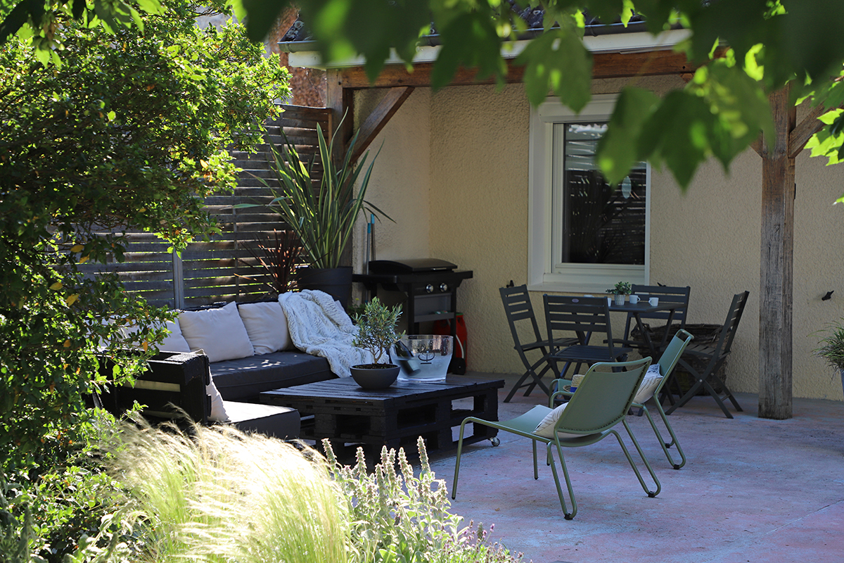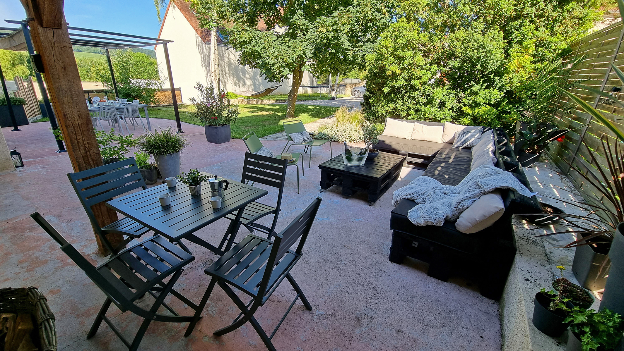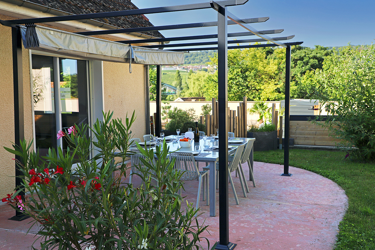 - Sur la première terrasse, exposée nord, un salon « made in Champagne » et une grande table pour vos repas en extérieur vous attendent.